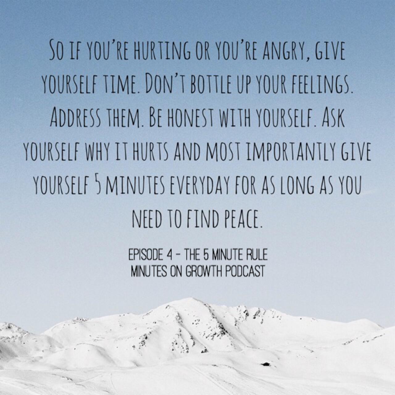 This is Tannaz Hosseinpour and welcome to this week’s episode of minutes on growth. Two weeks ago we discussed passion and purpose, and how we owe it to ourselves to pursue our true purpose in life. However on this journey of pursuit, a lot can happen that is out of our control. Negative factors beyond our reach can impact our mental state of mind such as the actions of our colleagues at work, our friends or even our family. I skipped last week’s episode because I was trying to find a way to cope with a hard and private situation I have been facing lately. They say that if it won’t matter in 5 years then you shouldn’t allow it to impact you now. But I am only human. I have emotions and feelings, and the situation may not matter in 5 years, but it matters now and I cannot shut my feelings off when something or someone hurts or angers me. If I do not know how to cope with these emotions in the correct way, and just push them aside for the time being, they will come back to hurt me one way or another in the future. Whenever a situation produces a negative reaction such as anger, fear or heart break within you, you have to ask yourself”Why is it happening and what is trying to teach me”. But this concept of self-reflection is much easier said than done. So while we’re trying to get to the root of the problem, how can we face it without letting it take over our whole life? I mean even if we get to the root of it, it may still hurt us. I found out that my situation, which was completely about someone else’s life and their choices, was trying to teach me to let go of my need to try and be the ‘fixer’ , but even though I knew that, it still hurt me. So with the help of my spiritual advisor, we came up with the 5 minute rule. Every day for 5 minutes I allow myself to feel all the feelings associated with the situation. During those 5 minutes, there have been days that I’ve cry, there have been days I just sit and stare at the wall and there have been days that i scream from the top of my lungs. But i allow myself to feel that hurt and that anger, but within a time limit. I will only dedicate 5 minutes of my day to this unfortunate situation. I will not allow it to take over my life. I will not allow it to prevent me from pursuing my purpose. I will not allow it to fog my clarity. But I will allow myself to be authentic and honest with myself and more importantly I will give myself time to heal. So if you’re hurting or you’re angry, give yourself time. Don’t bottle up your feelings. Address them. Be honest with yourself. Ask yourself why it hurts and most importantly give yourself 5 minutes everyday for as long as you need to find peace.