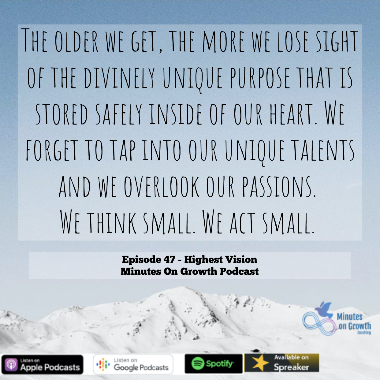 The older we get, the more we lose sight of the divinely unique purpose that is stored safely inside of our heart. We forget to tap into our unique talents and we overlook our passions. We think small. We act small.