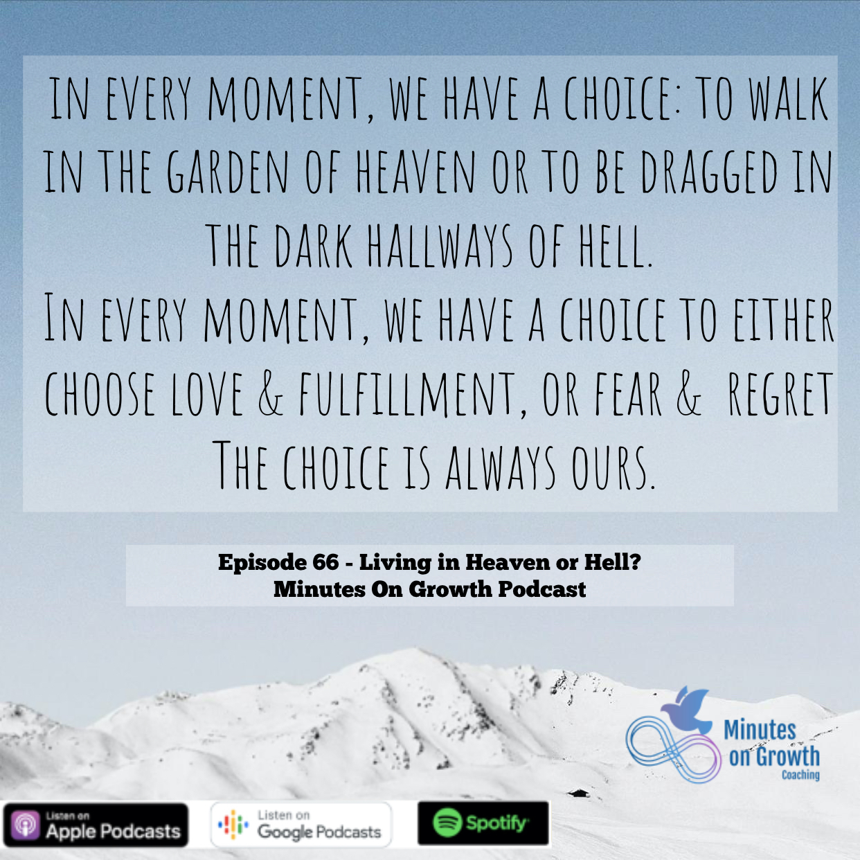 Its Tannaz Hosseinpour and welcome to another short solo episode of Minutes on Growth. Last night I had a dream that one of my family members had passed away. Thankfully, in the Persian culture, we believe that dreams of people passing away means that they’re going to live a long life. But it got me thinking about the idea of heaven and hell from a spiritual and non-religious standpoint