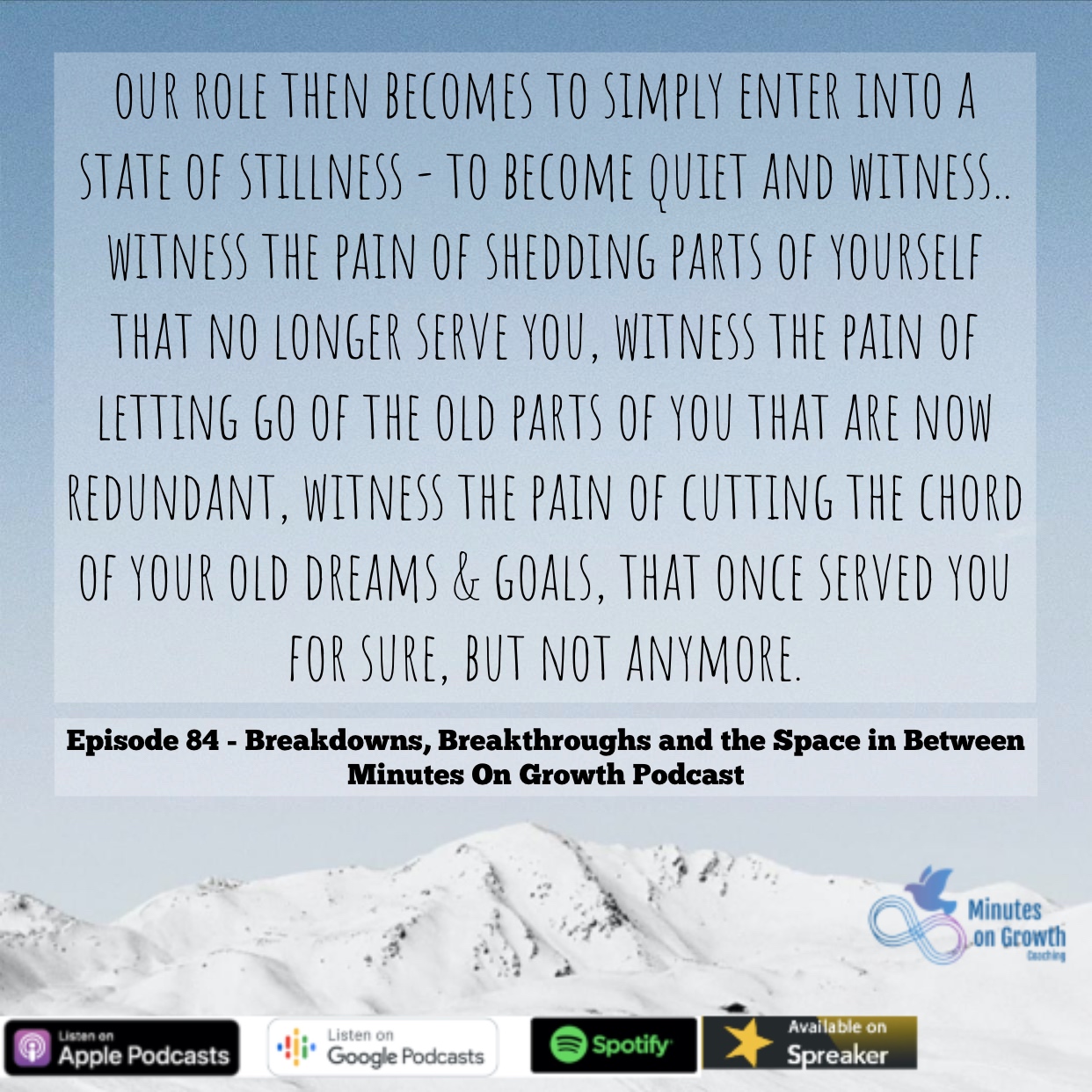 Well our role then becomes to simply enter into a state of stillness – to become quiet and witness.. witness the pain of shedding parts of yourself that no longer serve you, witness the pain of letting go of the old parts of you that are now redundant, witness the pain of cutting the chord of your old dreams & goals, that once served you for sure, but not anymore.