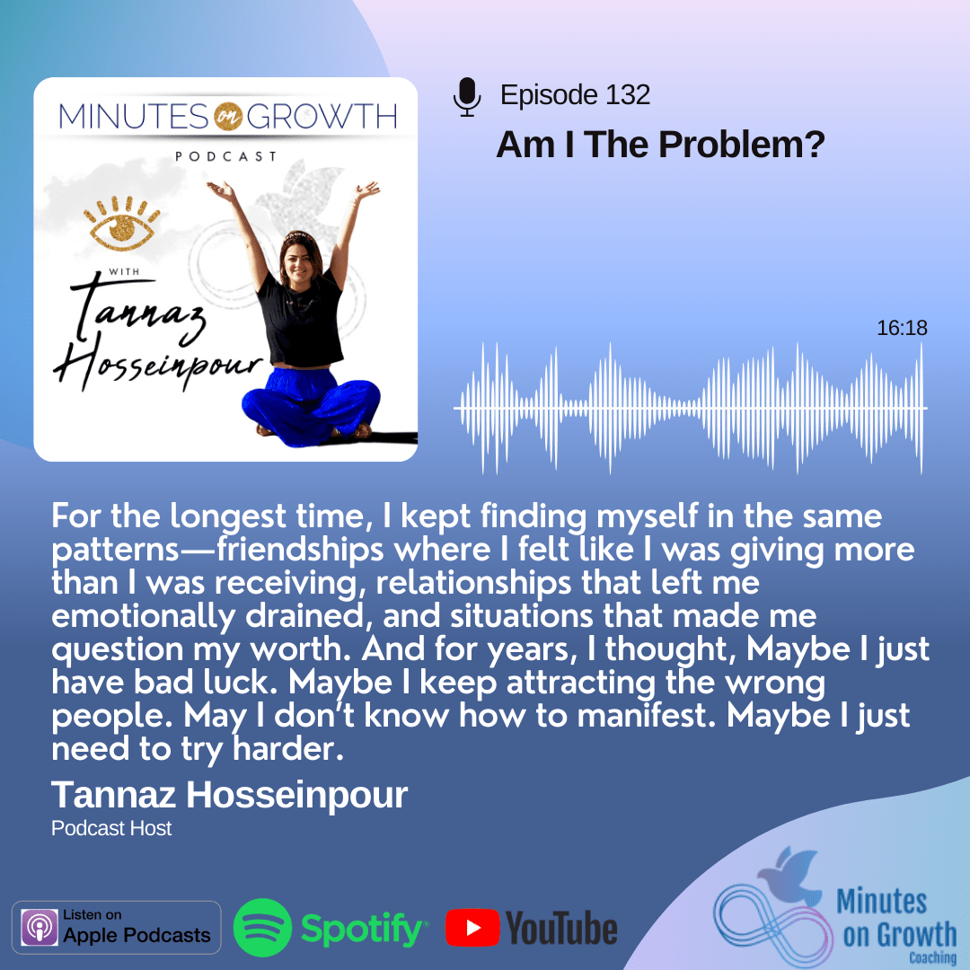It’s Tannaz Hosseinpour, and welcome to another short solo episode of The Minutes on Growth podcast. Before we begin, I wanted to begin by saying happy valentines day! may you all know that you are worthy of love, and feel the energetic frequency of love with yourself, with your friends, with your family, co-workers, strangers and with your romantic partner if you’re in a relationship. today as I woke up next to Ash, I couldn’t help but reflect on how I ended up here… the journey of getting to a place where I’m comfortable showing up as my true quirky self and experiencing life with an emotionally safe partner. Healthy relationships weren’t modelled to me growing up so to be able to change that narrative for myself is one I’m deeply grateful for. So I decided to dedicate today’s episode to the journey of getting here. Today, I want to share something deeply personal—an experience that shaped the way I showed up in relationships for years, without me even realizing it. And I want to talk about a question that changed my life and ultimately helped me get to where I am today: