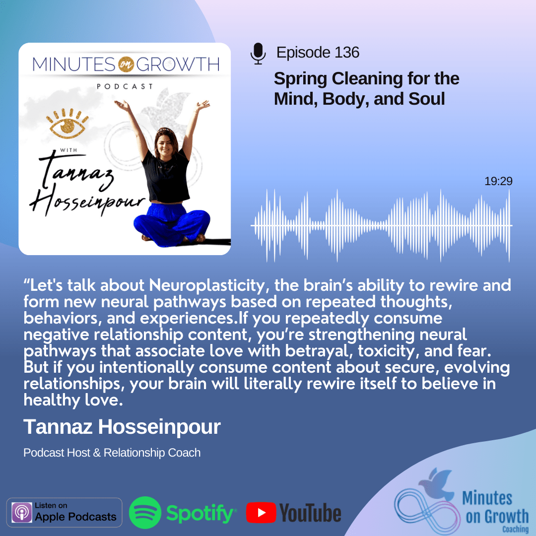 Hi Soul Friends, it’s Tannaz Hosseinpour, and welcome back to another short solo episode of the Minutes on Growth podcast. Today, we’re talking about spring cleaning—but not just in the way we usually think about it. Yes, we’re going to talk about clearing out the clutter in our homes, but we’re also going to go deeper. Because spring isn’t just about refreshing our physical spaces—it’s about detoxing our minds, beliefs, and relationships as well.