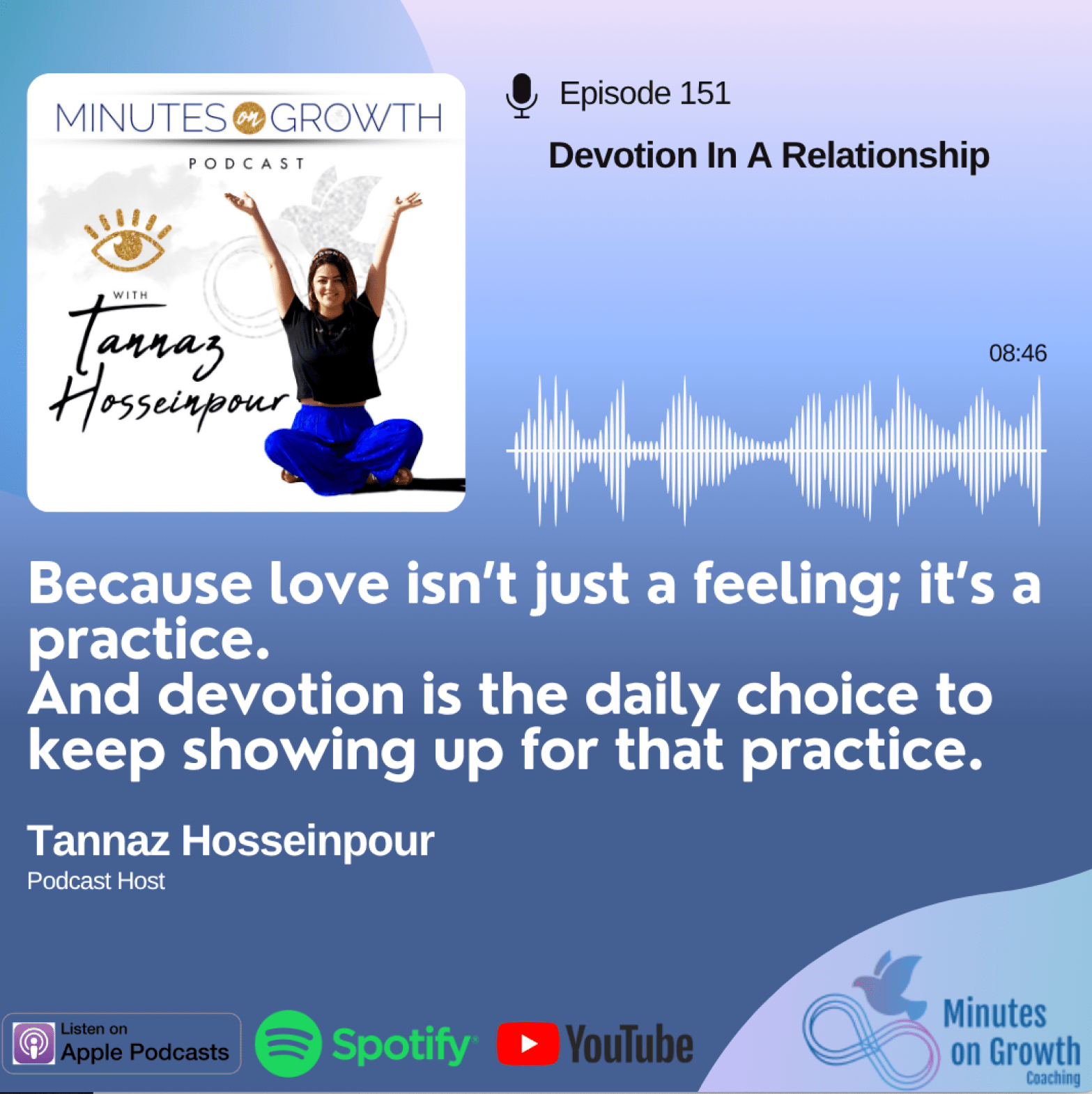 Click here to listen to Episode 151 of the Minutes on Growth Podcast on Spotify, on Apple Podcast, or to watch it on Youtube Hi soul friends, it’s Tannaz Hosseinpour, and welcome back to another solo episode of the Minutes on Growth podcast. Today’s episode is a heartful reflection on a word we don’t often hearContinue reading “Episode 151 – Devotion In A Relationship”